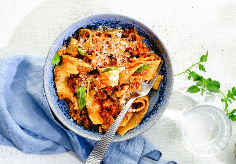 Hovedrett Ved å blande disse to pastarettene får du en dobbelt så god saus Pasta bolognese kombinert vår andre favoritt, pasta alla Norma, gir deg en dobbelt så god saus sammenlignet med vanlig kjøttsaus. Sausen er godt krydret med oregano, rosmarin og laurbærblad.