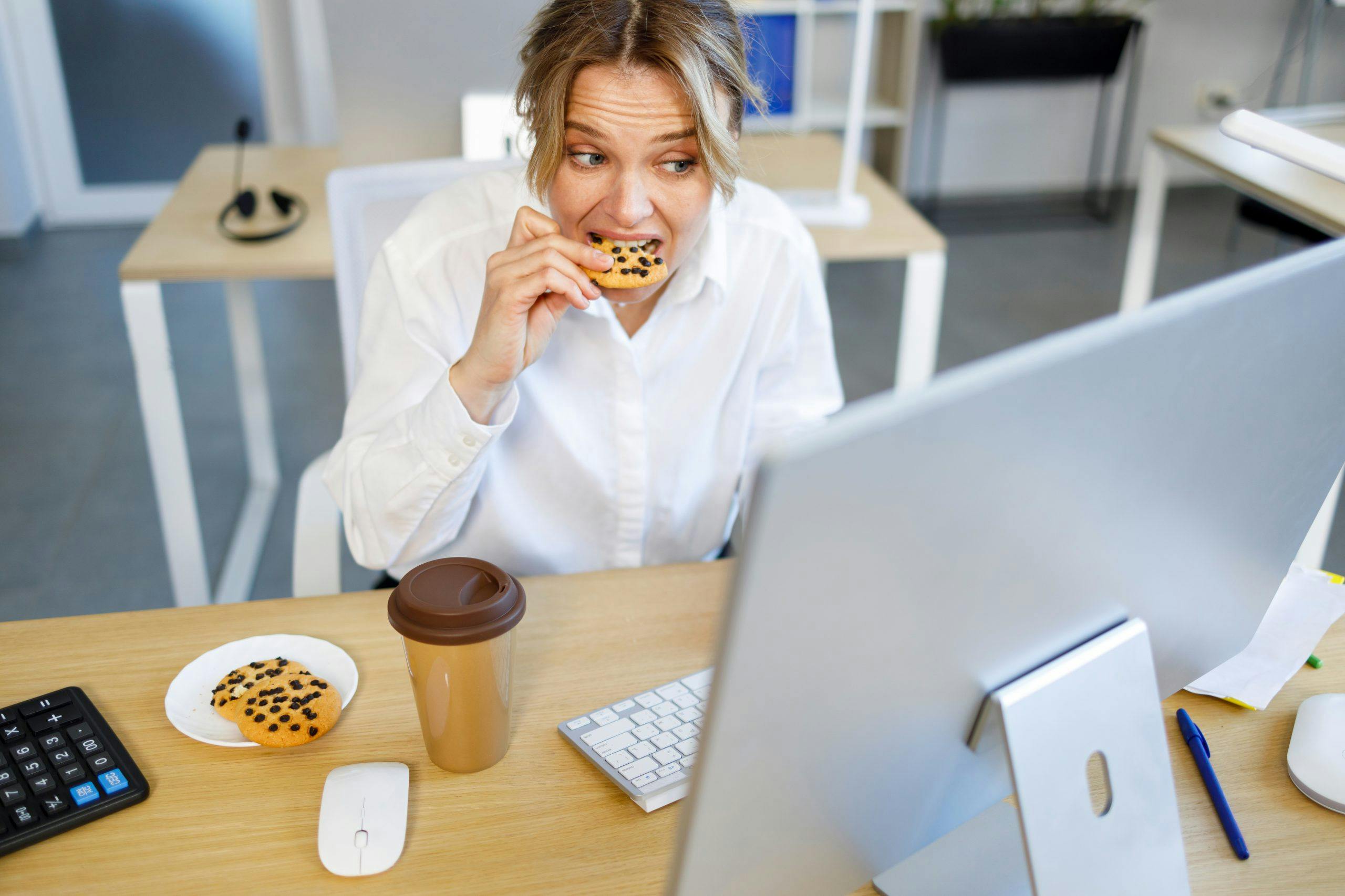 Du har mye å gjøre. Lunsj spiser du ved kontorpulten – du kaster i deg middagen. Noe som betyr at du ikke rekker å kjenne på metthetsfølelsen – og risikoen er stor for at du spiser mer enn du virkelig trenger. Konstant stress gjør det også lettere å gå opp i vekt, viser forskning. Stoffskiftet påvirkes og kroppen brenner fett saktere.