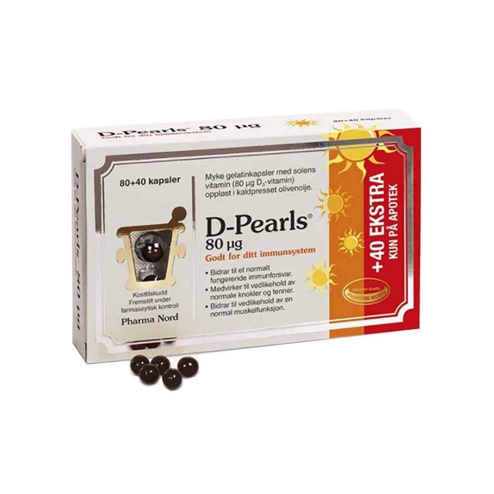 D-Pearls fra Pharma Nord styrker immunforsvaret og gir vedlikehold til skjelettet og en normal muskelfunksjon. D-Pearls er lette å svelge, med 80 mikrogram D3-vitamin i hver lille kapsel. D-vitaminet er oppløst i kaldpresset olivenolje. 219 kr for 120 kapsler.