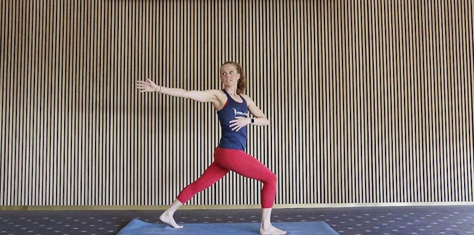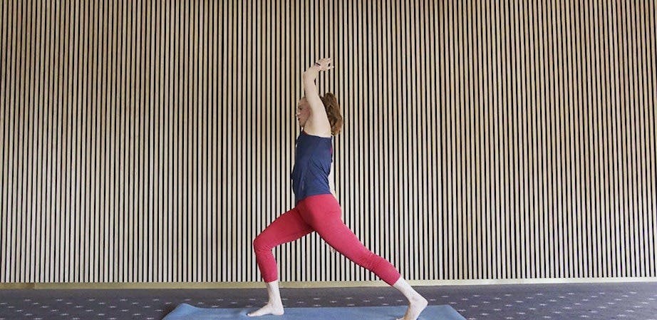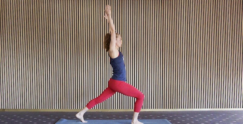 - Stå i klassisk utfallsposisjon: Sett det ene benet foran deg slik at kneet er bøyd, leggen loddrett og overkroppen strak.