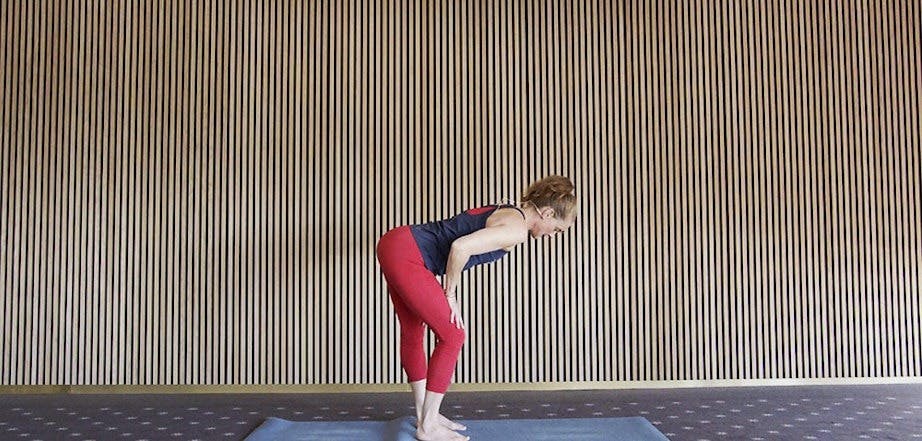- Hold stillingen og «gå» på stedet: Bøy vekselvis i knærne, behold hælen i gulvet. Kjenn at hele baksiden og hoften beveges og strekkes.