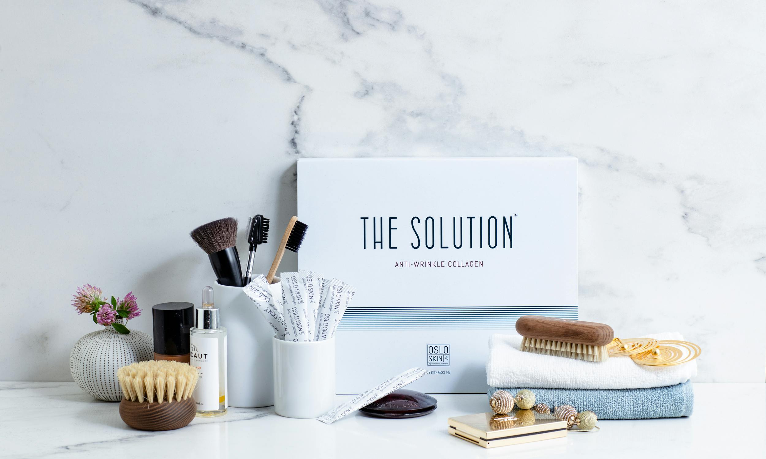 The Solution har vært en av skjønnhetsbransjens store snakkiser de siste årene. Dette er et kollagenpulver, uten smak eller tilsetningsstoffer, som kan mikses i valgfri mat eller drikke. Daglig inntak har gjennom studier vist seg å kunne øke hudens elastisitet, samt forebygge og redusere linjer og rynker.Her kan du lese mer om studiene.