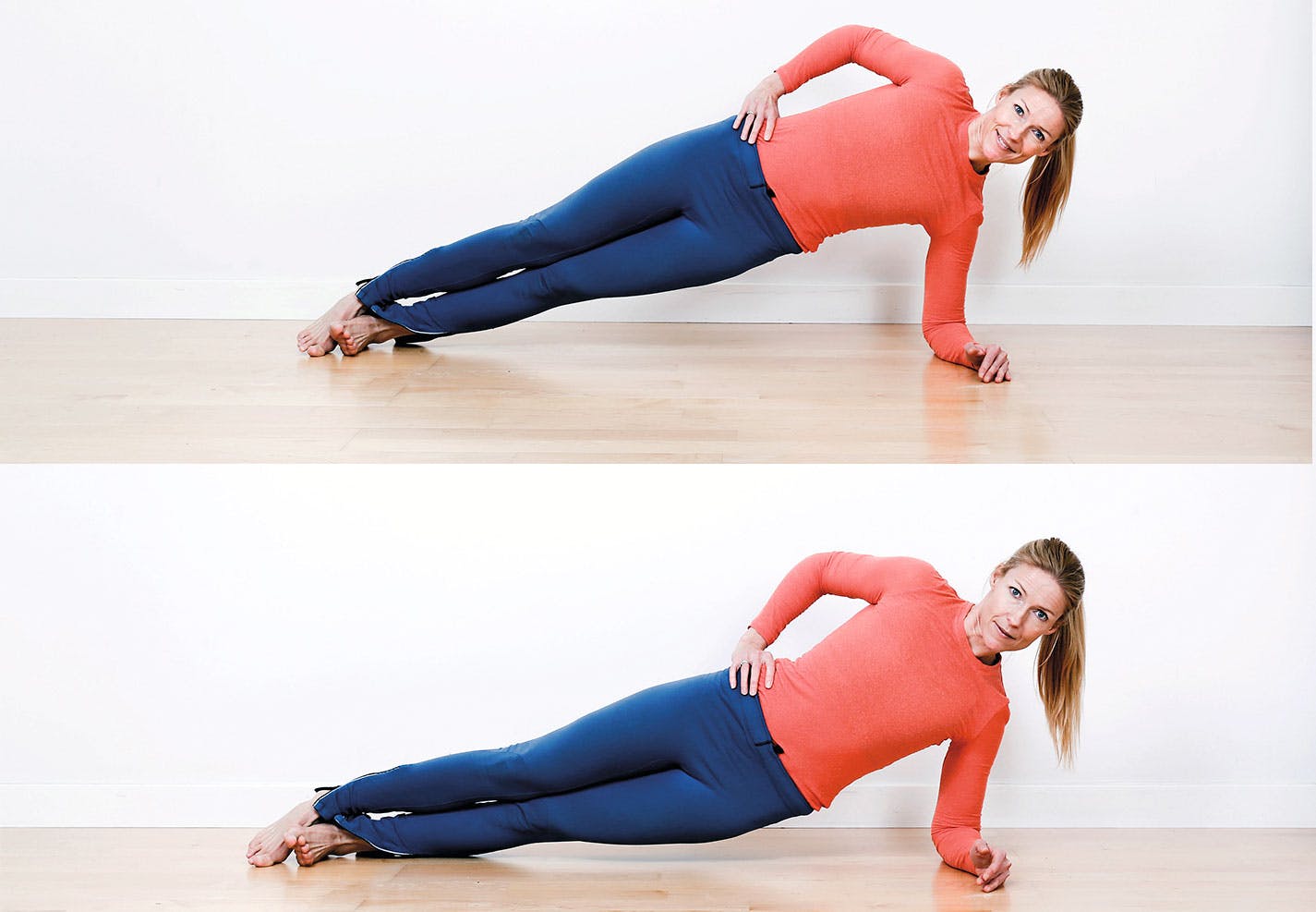 Legg deg på siden med rette ben. Støtt deg på albuen. Spenn mage og rygg. Løft hoften opp til du har laget en fin, rett linje fra føttene og opp til skuldrene. Senk deg mot gulvet igjen, men før du er helt nede, løfter du deg opp igjen.