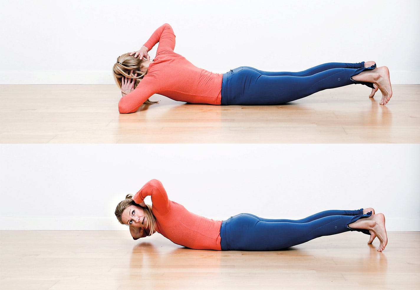 Legg deg på magen, bøy albuene og fest hendene lett på bakhodet. Stram rumpa og løft knærne fra gulvet. Tærne skal berøre gulvet. Løft høyre albue og vri overkroppen og hodet mot høyre. Kikk skrått oppover. Senk ned til utgangsposisjon, og bytt side.