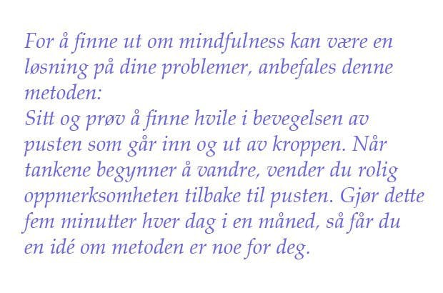 Ifølge Sissel er den største utfordringen for mange å sette av tid til øvelsene. Vigdis bruker en halv time daglig, og veksler på å gjøre kroppsbasert avspenning og meditasjon. Innimellom gjør hun også yogaøvelser. Og hun prøver å være tilstede der hvor hun er.