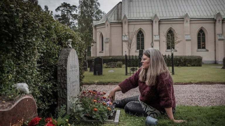 Grusen knaser under skoene idet Carina går mot graven med nyinnkjøpte høstblomster. Hun setter seg ned på bakken, tar fram spaden og begynner å grave.