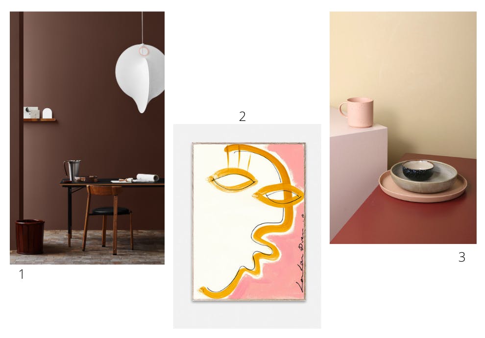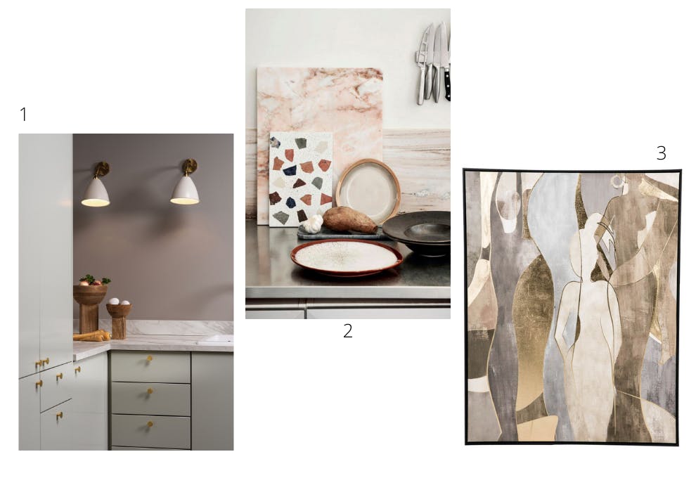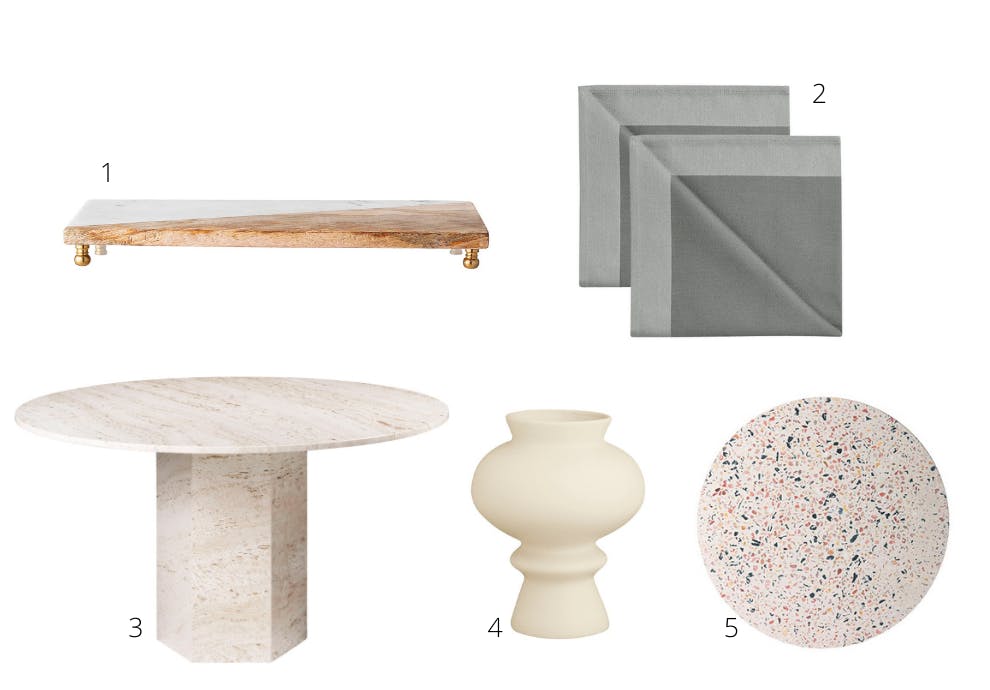 2. Skjærefjøl i rosa marmor, 1190 kr, brett i terrazzo, 619 kr, brett i grå marmor, 299 kr, asjett, 129 kr, tallerken, 169 kr, dyp tallerken, 299 kr, alt fra HK Living.