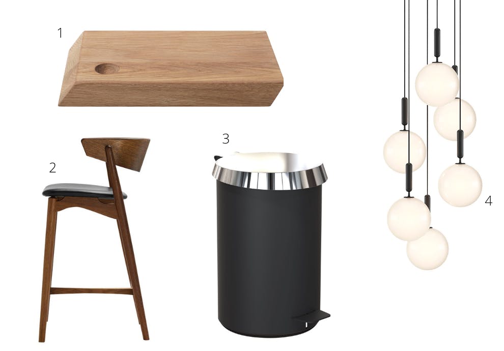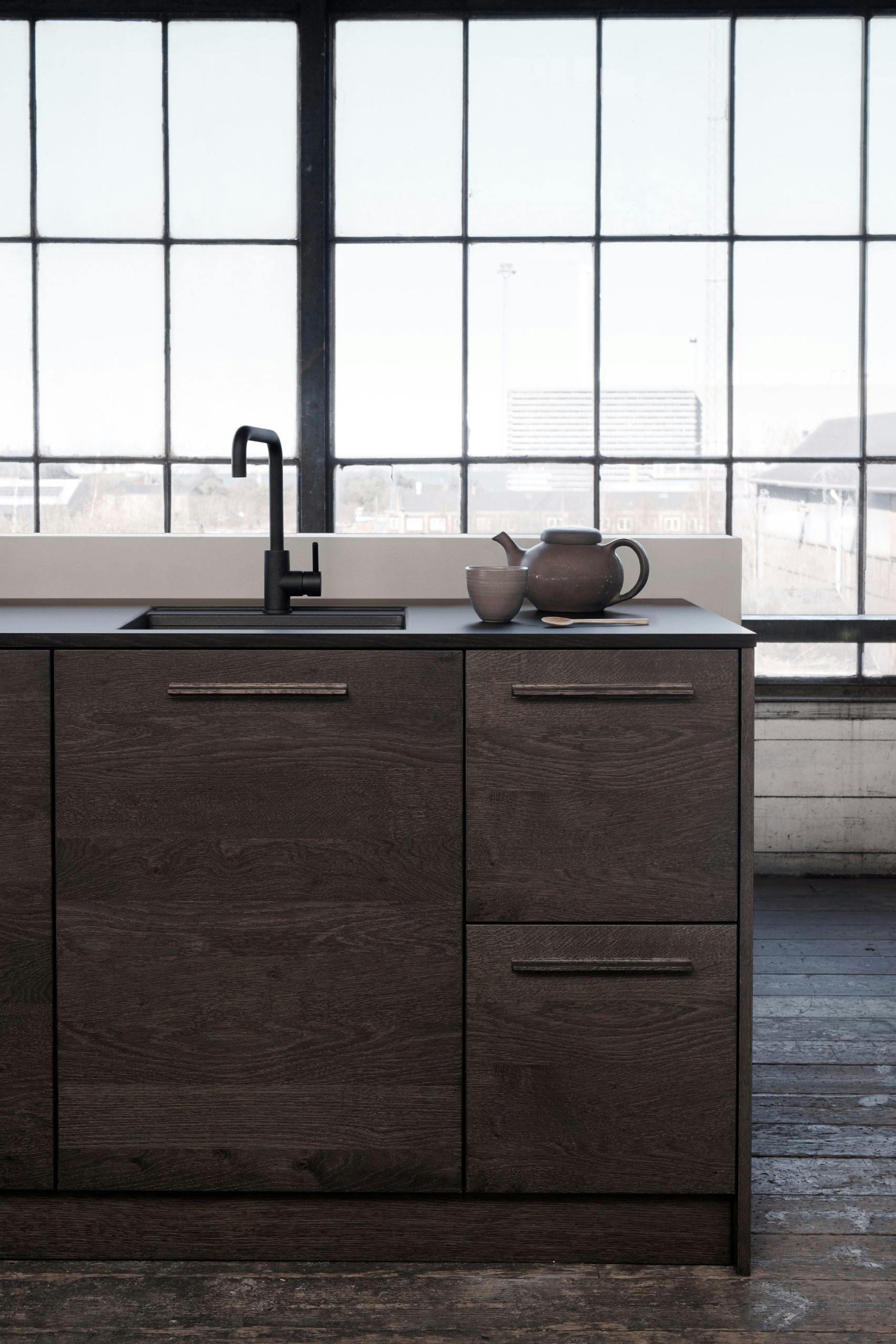 IDÉ! Kombiner mørkt tre med armatur, benkeplater og vask i svart for å skape et rolig uttrykk.