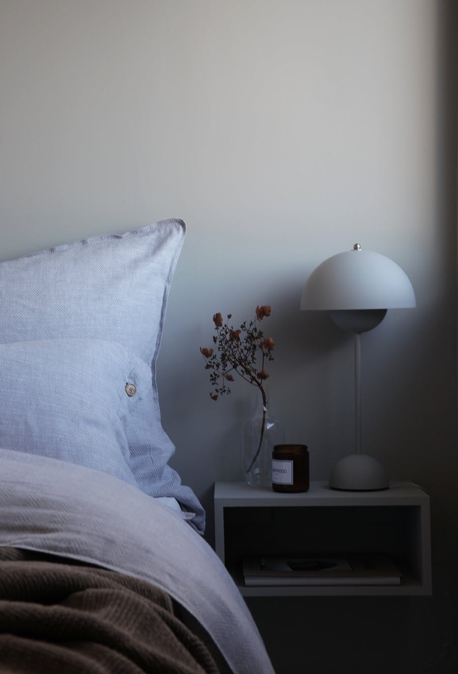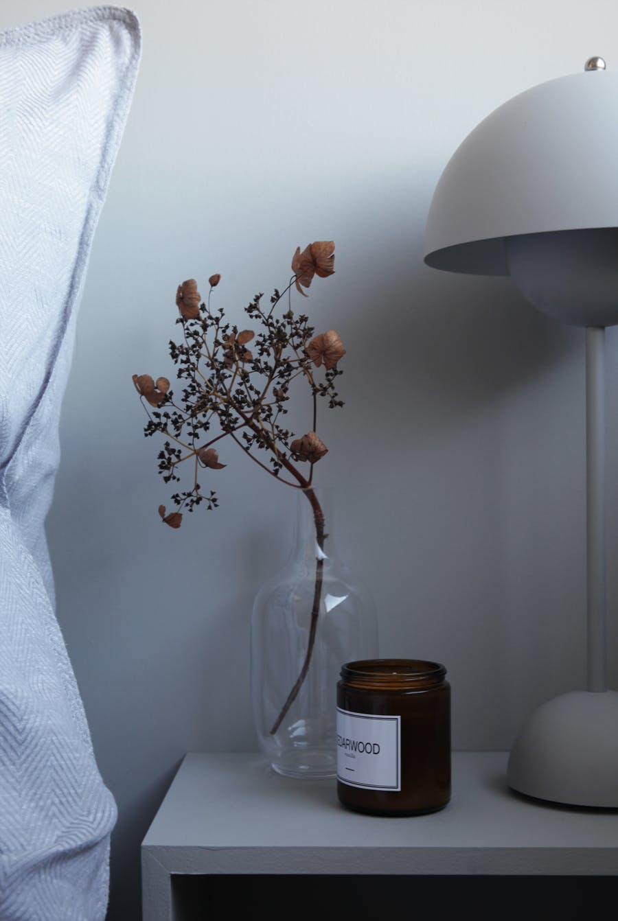 Den tørkede kvisten fra klatrehortensiaen reddet Elisabeth inn rett før snøfallet, og duftlyset er en ny skatt fra København. Copenhagen Candle Lab lager lysene av kun naturlige ingredienser i et lite studio i København. Men den viktigste delen av høststylingen på soverommet er selvfølgelig tekstilene.