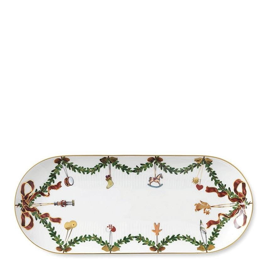 Stjerne Riflet Jul fra Royal Copenhagen har vært i produksjon siden 2006 og har siden da skapt en luksuriøs ramme rundt julematen med grankranser, julepynt og silkebånd som dekor på benporselenet. Ovalt serveringsfat til ribbe, pinnekjøtt og juletorsk, 39 cm, 1049 kr.