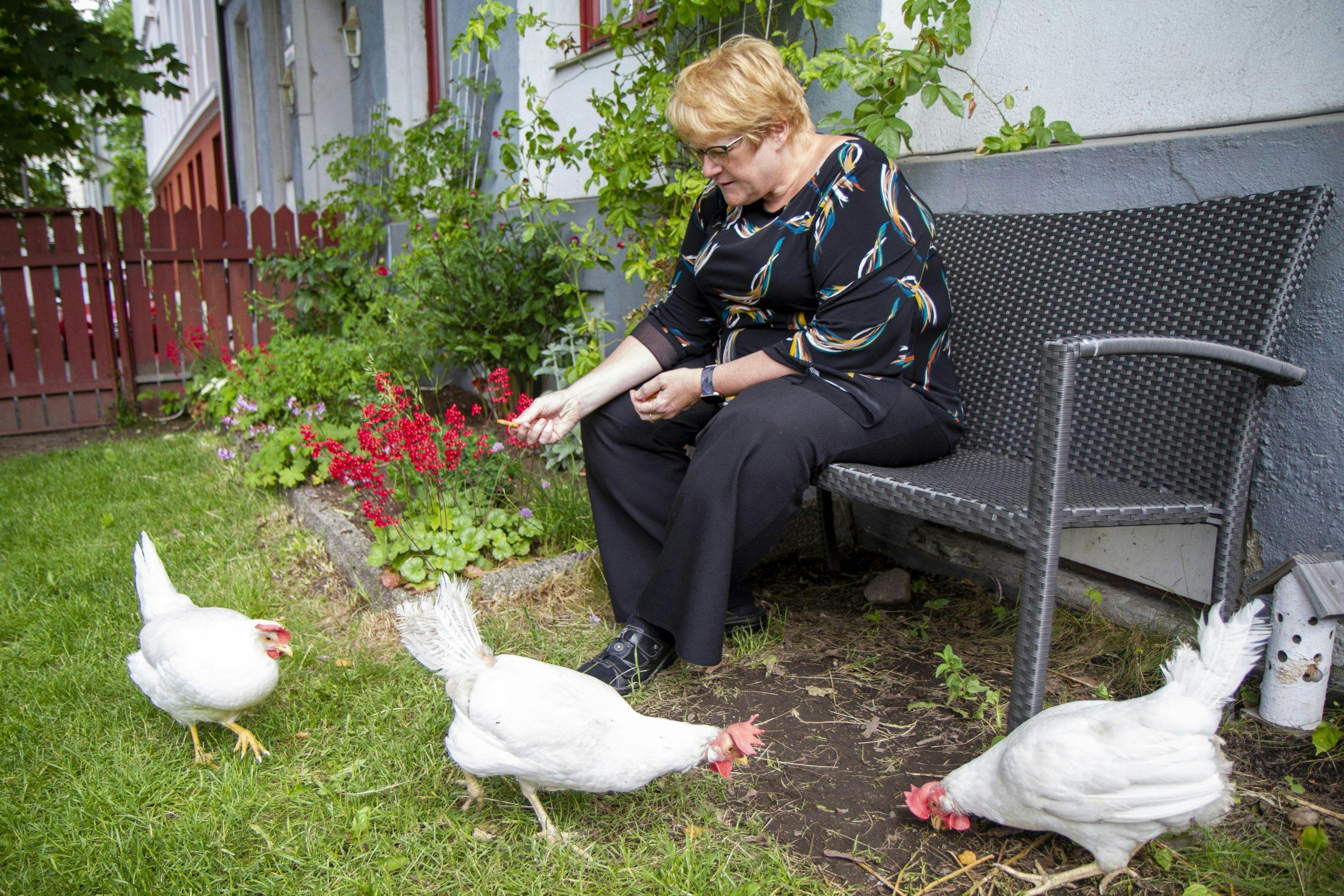 Selv om venstretoppen har fått utfoldet seg mer enn før med huslige sysler i sin «korona-isolasjon», er det først og fremst, og til alle døgnets tider, politiker hun har vært – også under karantenen siden mars. Sånn sett har det ikke vært noen isolasjon, men hardt arbeid døgnet rundt. Først var det telefonmøter og dokumentarbeid innendørs. Dit kunne ikke mange komme fysisk. Men i sommermånedene har hun håndtert å styre Venstre og være stortingspolitiker fra hagen i Gamlebyen. Det var politiske møter og diskusjoner på det grøderike arealet, riktignok med avstand.Her kunne Grande spasere inn og ut og servere kaffe innimellom diskusjonene. Og her har rikspolitikere fått et visst innsyn i hønsehold i hovedstaden.