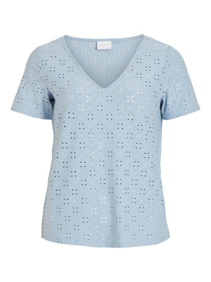 Blå sommertopp med korte ermer i stretch-stoff. Fås kjøpt her fra Vila for 199 kr.