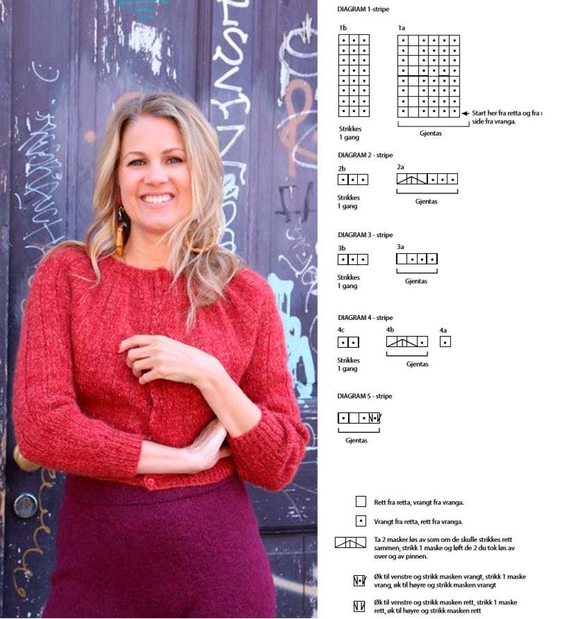 Strikk etablert ribbestrikk over de 8 første maskene (husk knapphull), gjenta diagram 1a til det gjenstår 11 masker. Strikk diagram 1b 1 gang og strikk 8 masker i etablert ribbestrikk. Denne pinnen strikkes bare for at man skal starte diagrammet fra vranga slik at striper gjøres fra en pinne fra retta, så start på første rad i diagrammet på pinne 1 når du fortsetter: