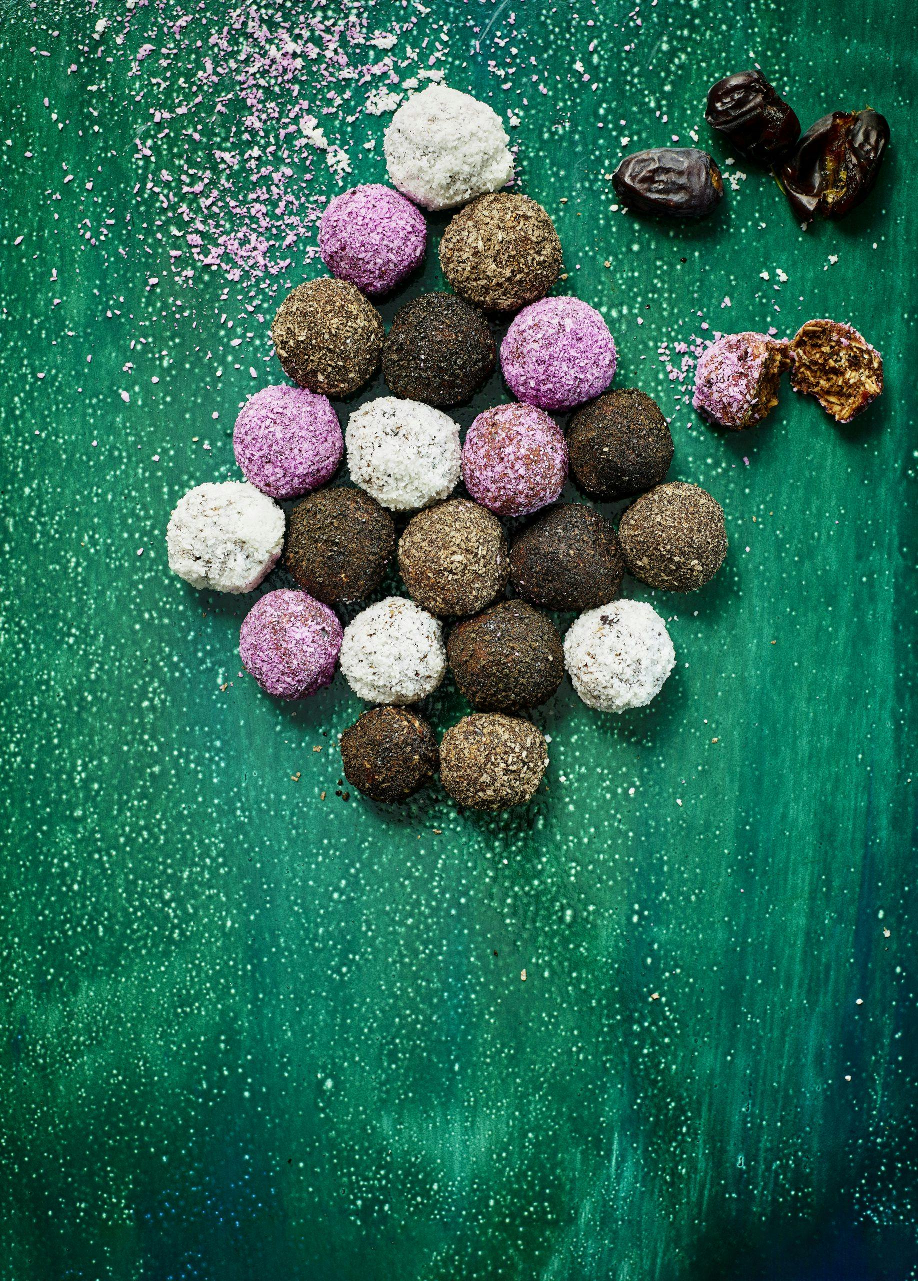 2. Gjør klart strøsselet til kulene. Kjør kokosmassen i en blender så konsistensen blir finere – da fester den seg lettere på kulene. Ha i smakstilsetning, f.eks. bringebærpulver, og kjør det litt til i blenderen. Hell de ulike tilsetningene i små skåler.