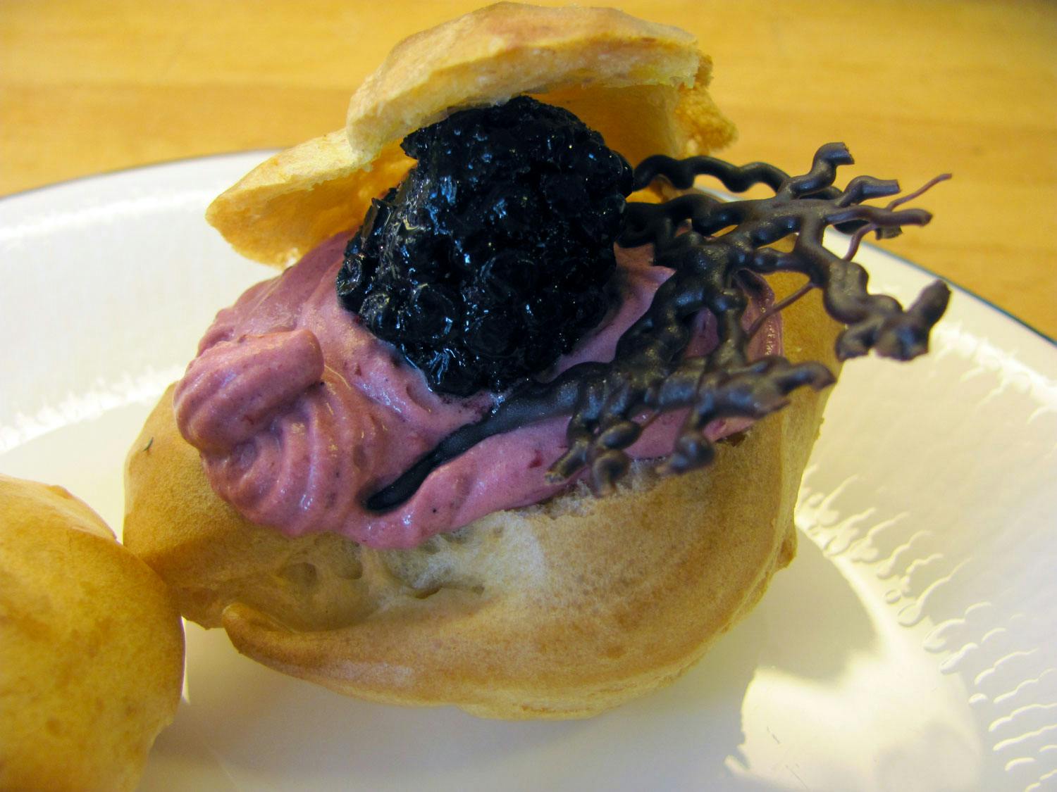 Ruth Helen fyller sprø vannbakkels med frisk krem laget med bjørnebær eller rabarbra.