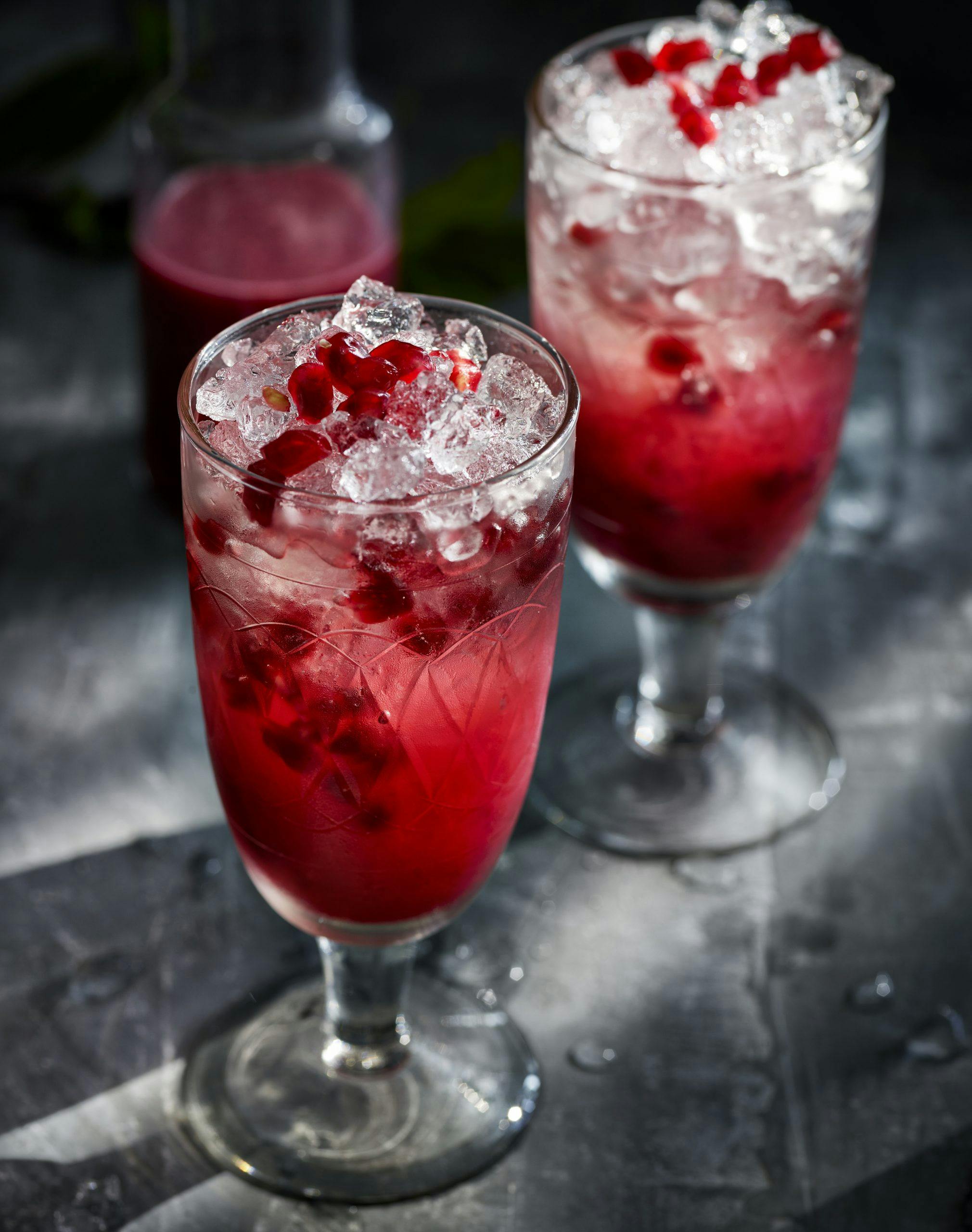- Fyll på med mer isbiter og pynt drinkene med resten av granateplekjernene.