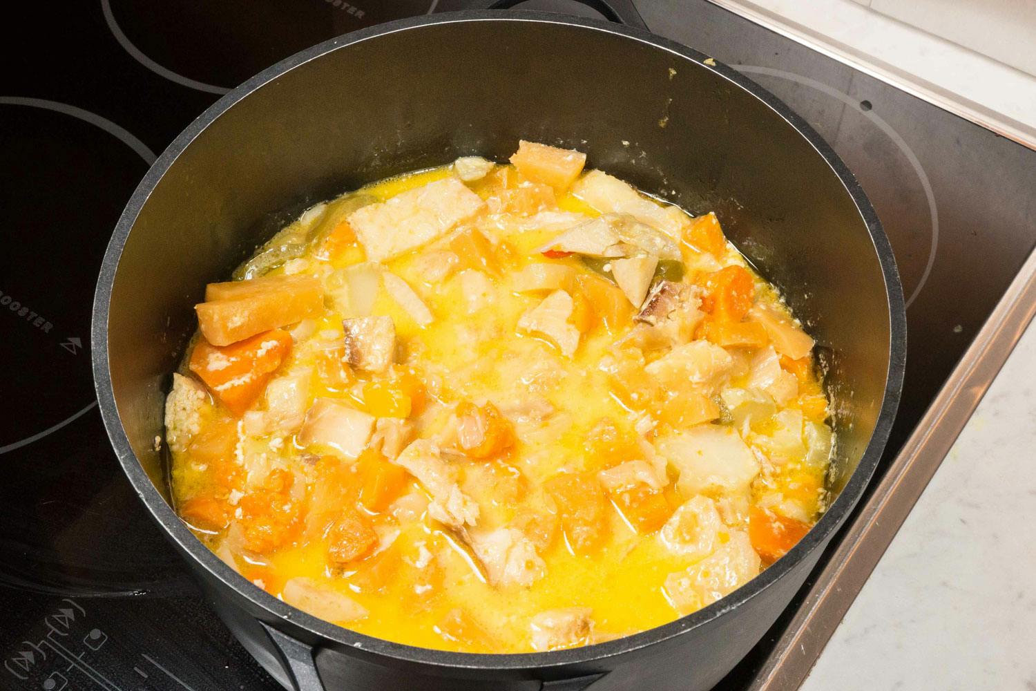 - Klippfisk, poteter og grønnsaker has lagvis i gryta med en skje løkblanding her og der. Slå over litt fløte og kok opp forsiktig under lokk. Det vil komme væske fra grønnsakene og fisken, så her må du følge med. Slå på mer fløte etter hvert.