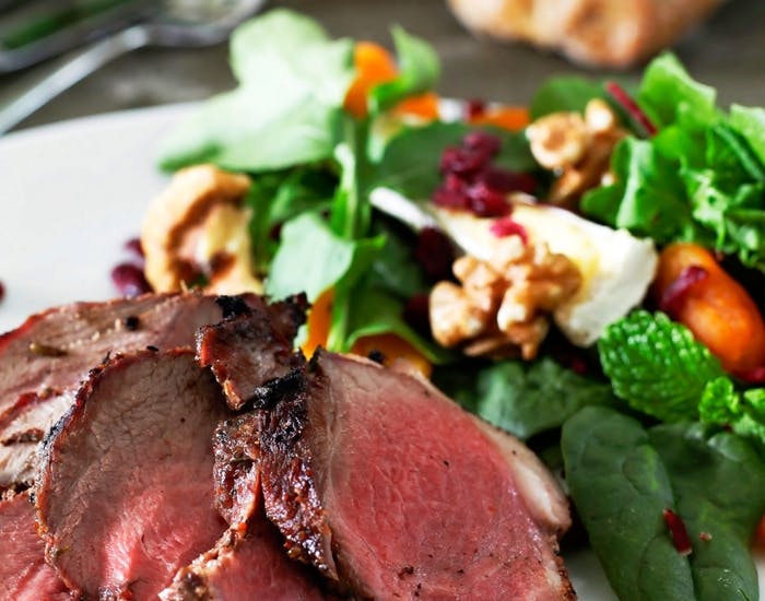 La kjøttet hvile i 10 min. før oppskjæring. Husk at kjøttet skal være rosa inni!