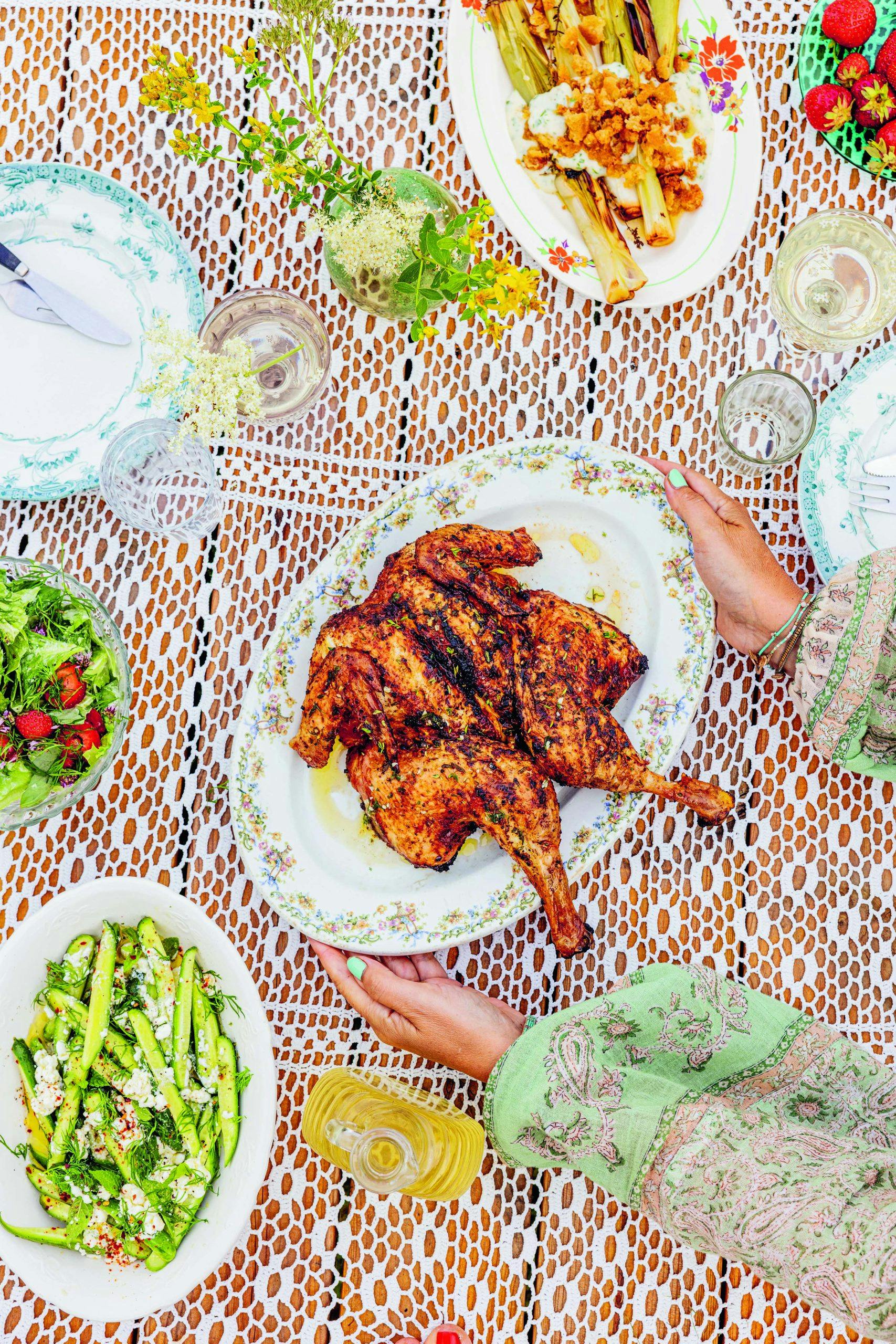 Fyr opp grillen og grill kyllingen over indirekte varme (rundt 180 grader) med brystet opp i 35–60 minutter, avhengig av varmen på grillen og størrelsen på fuglen. Grill til skinnet er sprøtt og kyllingen g jennomstekt (65 grader kjernetemperatur på den tykkeste delen).