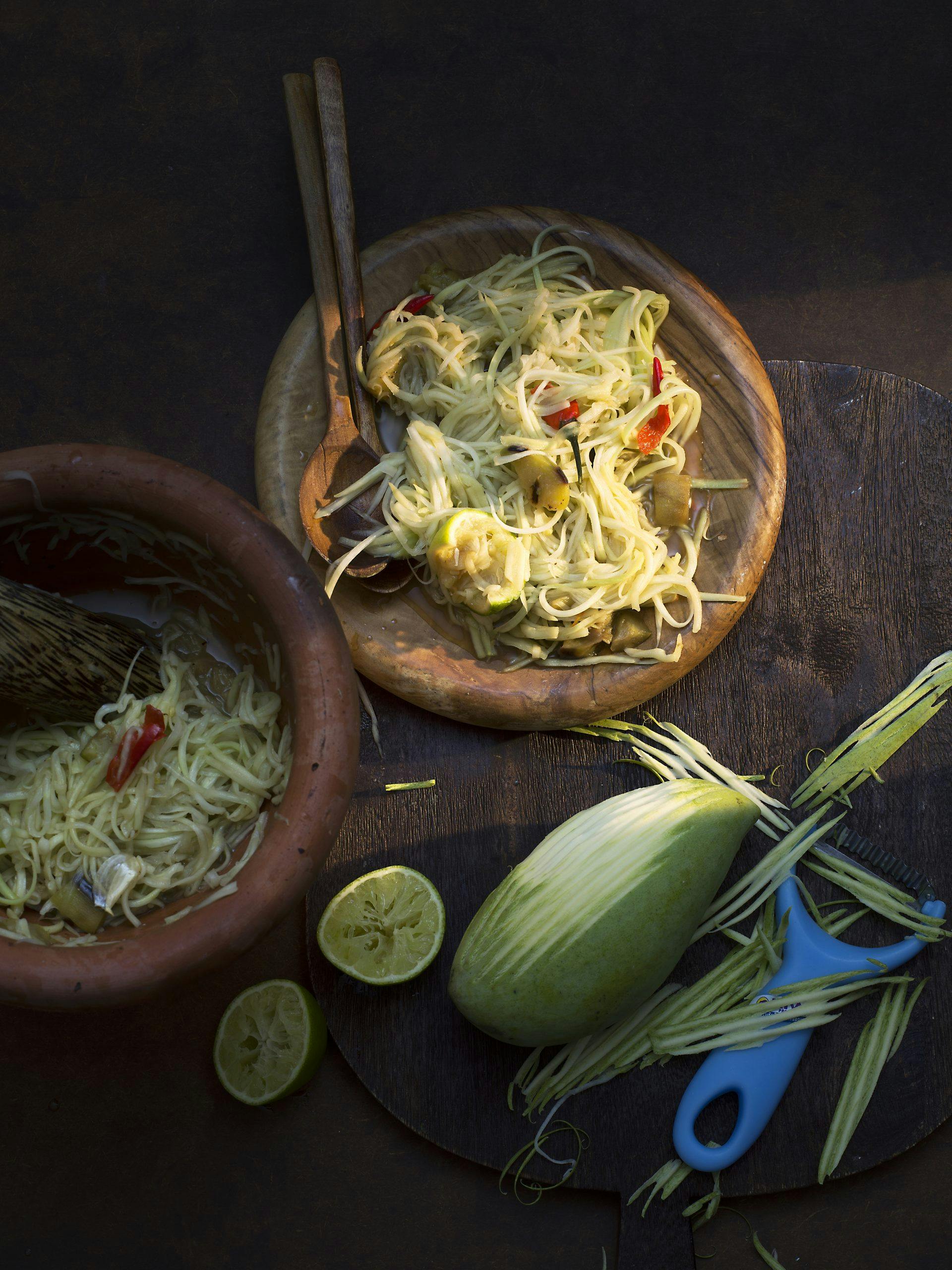 I Thailand bruker de ofte aubergine, og det finnes en stor variasjon i størrelse, form og farge. De mortes gjerne rå i salater, men her er en variant med tilberedt aubergine som gir en myk konsistens sammen med papaya og grønn mango, det vil si umoden, syrlig mango.