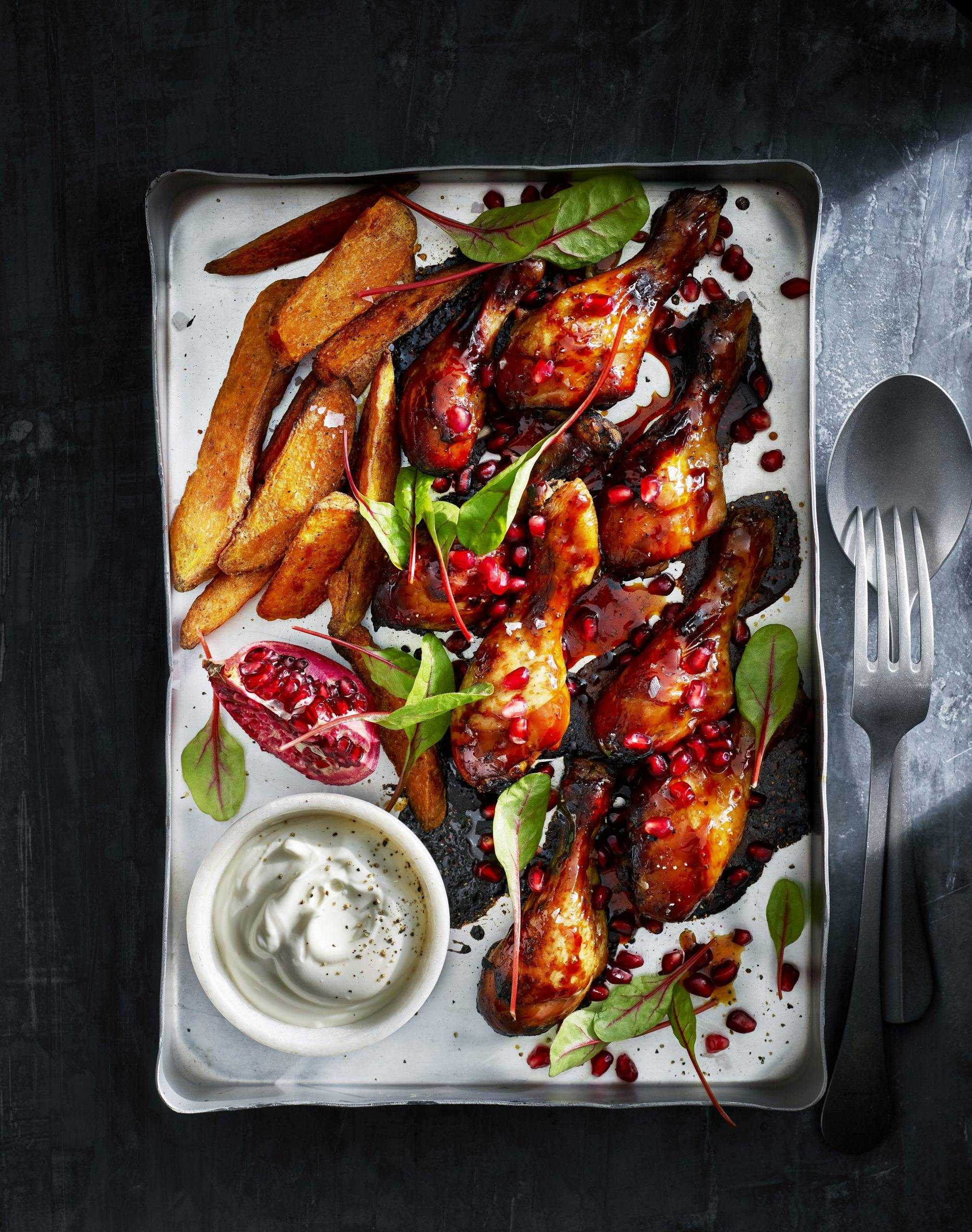 Oppskrift på sticky kyllingklubber med granateple og søtpotet