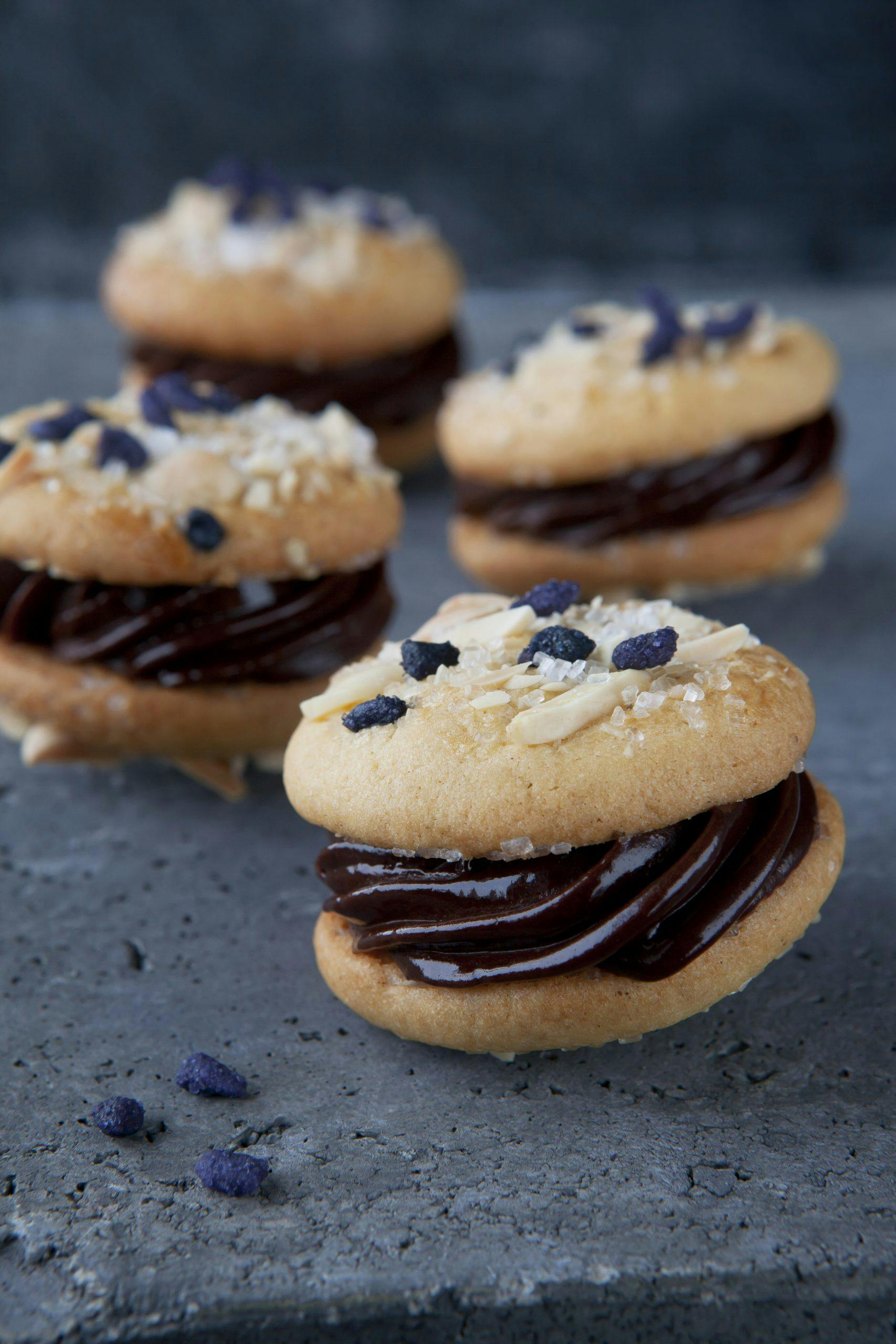 Fyll sjokoladeganachen i en sprøytepose med stjernetip og sprøyt litt ganache på halvparten av serinakakene. Topp med de resterende kakene og press «sandwichene» lett sammen.