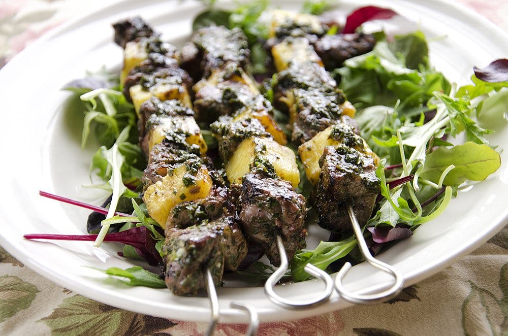 – Jeg vet ikke hvor overraskende det er, men kombinasjonen av den sterke persillesausen og de grillede ananasskivene, på disse grillspydene er knallgod.