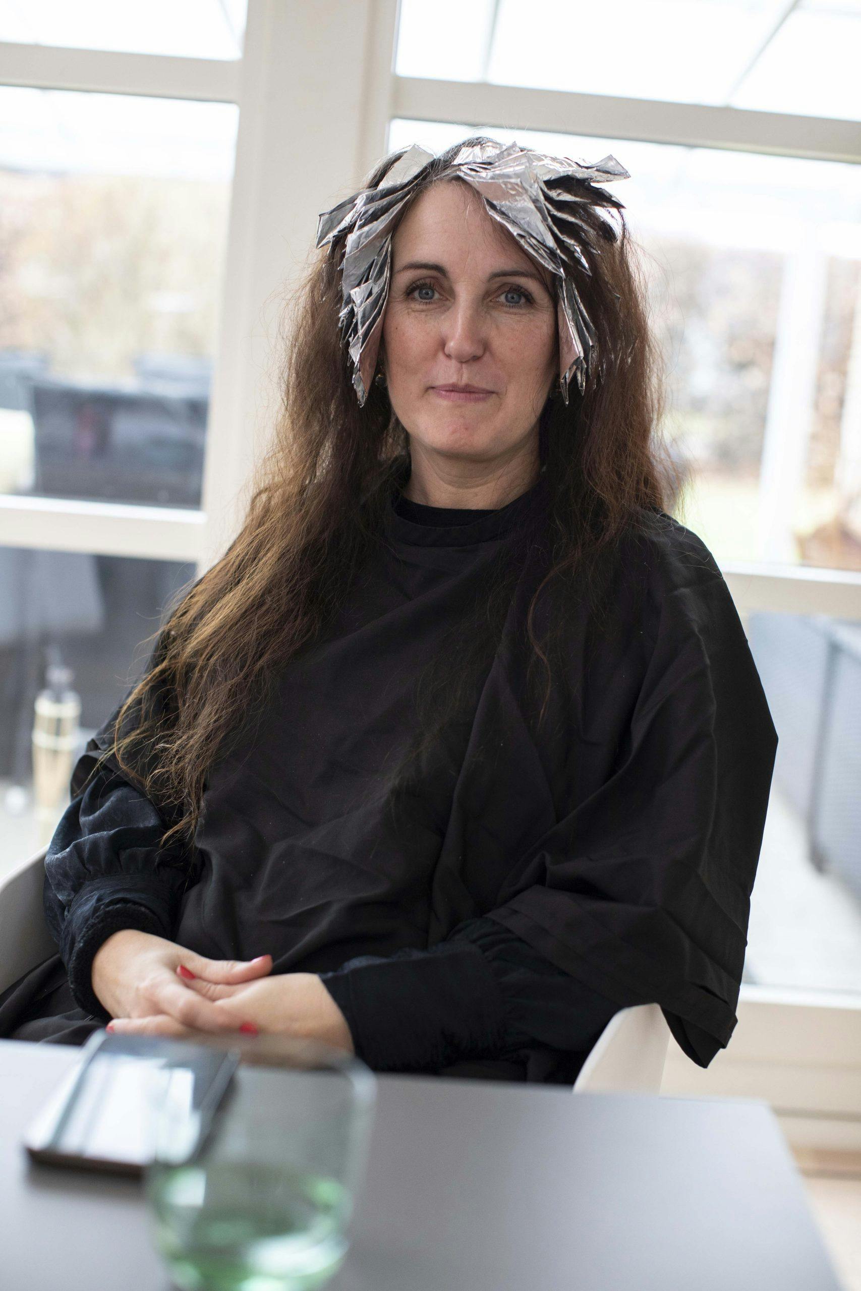 Derfor starter vi forsiktig opp. Jeg striper hele håret til Fleur med en lys, kjølig gråbrun farge. Den matcher både det grå håret og det fargede håret og demper overgangen mellom de to hårfargene. Jeg gir også Fleur en lysning av håret i front for å ramme inn ansiktet. Det åpner opp og gir et fargespill. Resten av håret får en toning som frisker opp den gamle hårfargen.