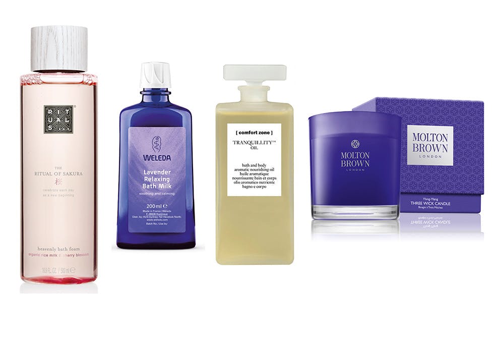The Ritual of Sakura Bath Foam fra Rituals gir deilig duft og skum i badevannet, 500 ml, 150 kr. Lavendelduftende bademelk fra Weleda som skal virke avslappende på kroppen, 200 ml, 229 kr. Noen dråper Tranquility Oil fra Comfort Zone med aromatiske oljer mykgjør og beroliger, 200 ml, 1030 kr. Ylang Ylang duftlys fra Molton Brown med tre veker og beroligende duft, 735 kr