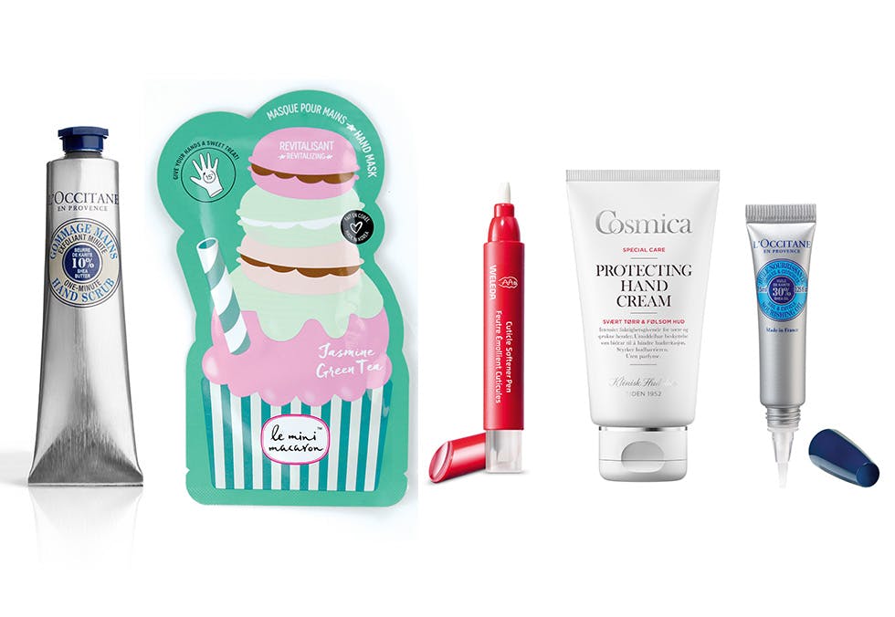 One Minute Hand Scrub fra L´Occitane fjerner døde hudceller på hendene på en mild måte, 75 ml, 139 kr. Håndmaske fra LeMiniMacaron i form av fukthansker du tar på og lar virke i 15 minutter, 59 kr. Penn fra Weleda som mykgjør neglbåndene, 139 kr. Protecting Hand Cream fra Cosmica er tilpasset tørr, sensitiv hud, 75 ml, 99 kr. Nail and Cuticle Oil fra L´Occitane med sheaolje som mykgjør neglbåndene og skal styrke neglene, 7,5 ml,139 kr.