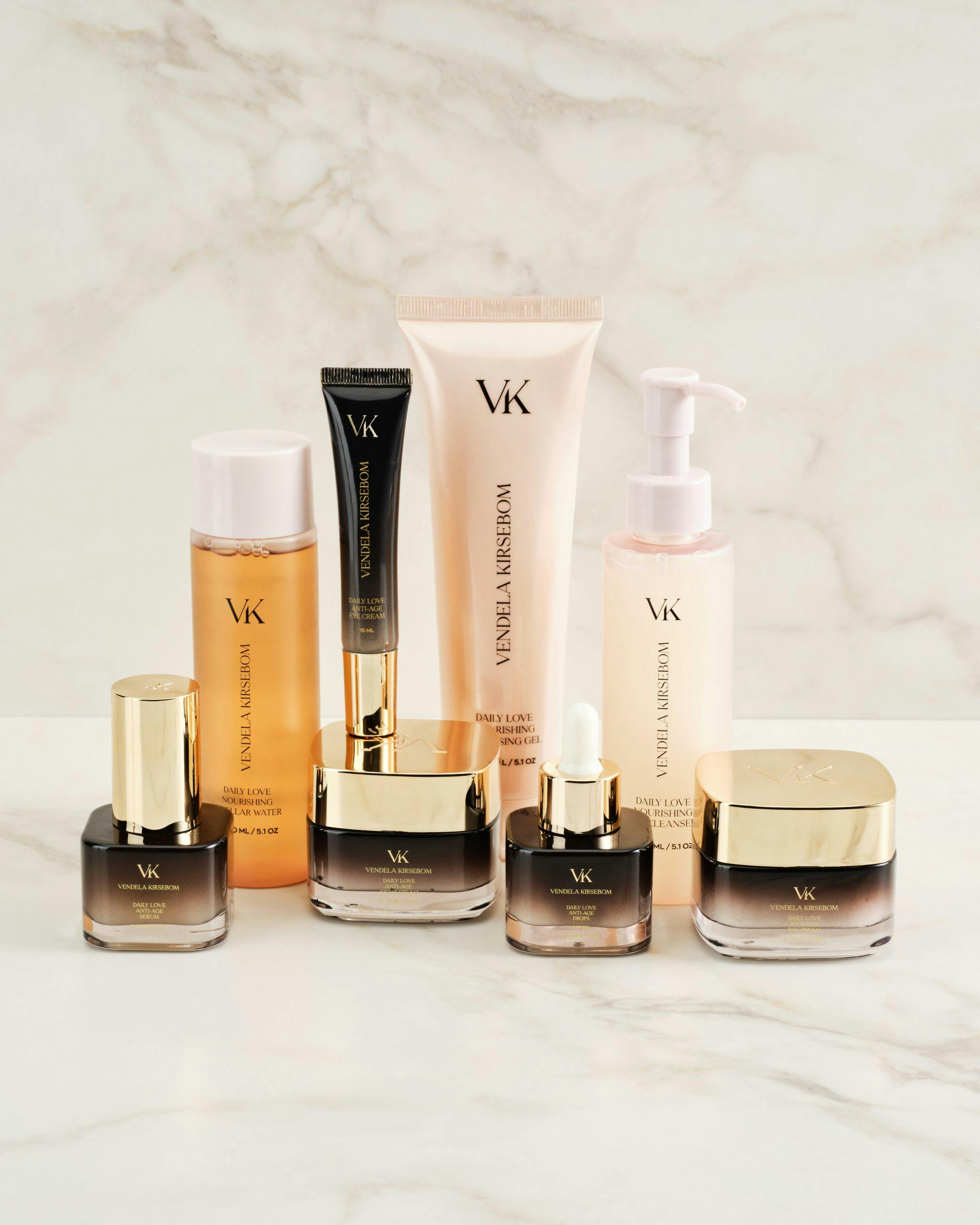 – Jeg vil favne alle aldersgrupper. Glød, fukt og solfaktor er viktige stikkord. Dobbeltrens morgen og kveld er veldig i tiden, og selv bruker jeg både cleansing oil og micellarvann. Og et vitamin C-serum, sier Vendela Kirsebom – som er ikke i tvil om at hun som voksen kvinne er blitt både klokere og modigere, både innen business og sitt private liv.
