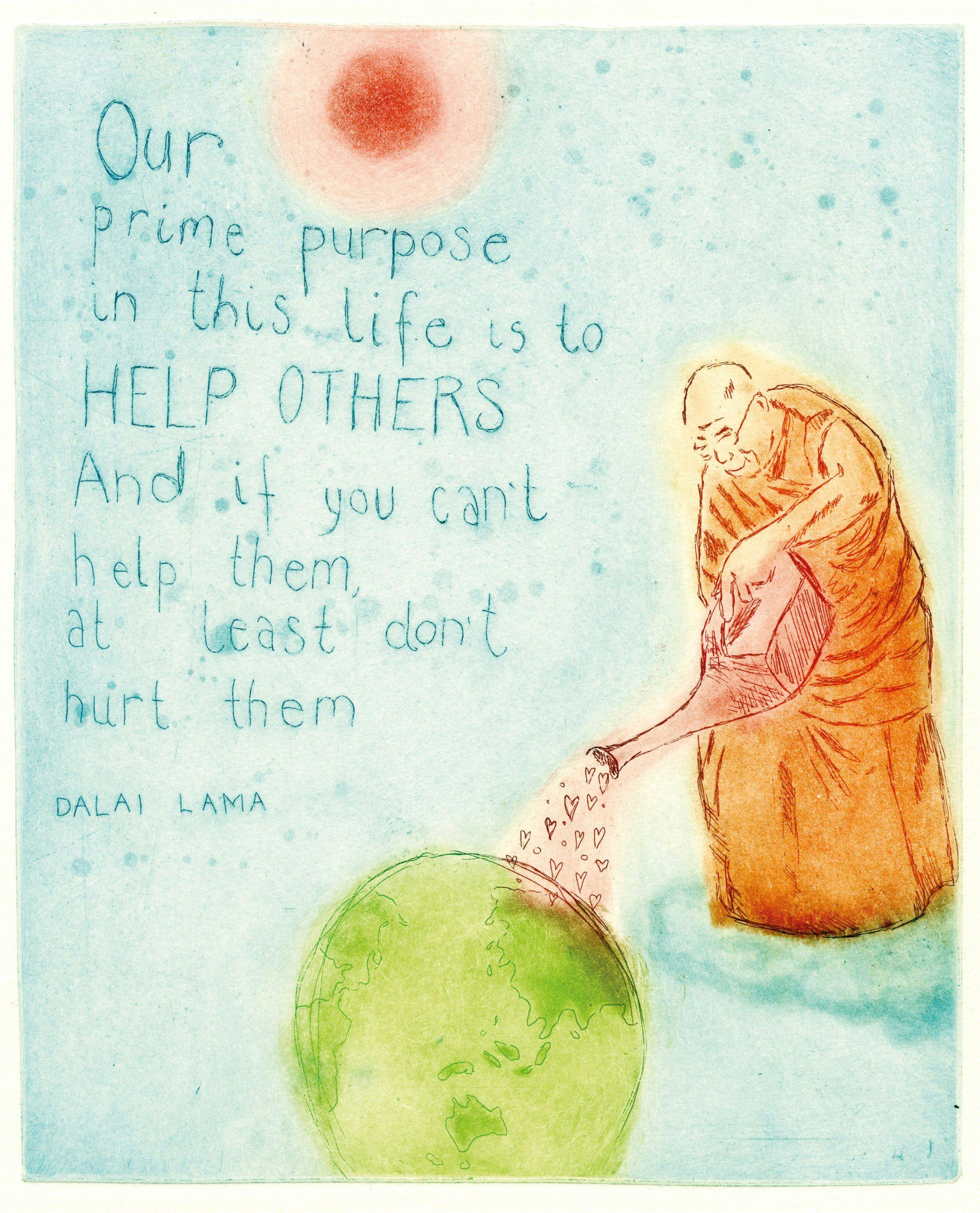 Jeg lagde et bilde av Dalai Lama som vanner jordkloden med kjærlighet. Med sin tankegang, med sin visdom og med den han er. Med at han ikke viser vold når andre kanskje ville vist vold. Han snur det andre kinnet til og viser kjærlighet. For meg er han et stort forbilde. Av alle mennesker i hele verden er han den jeg helst vil møte.