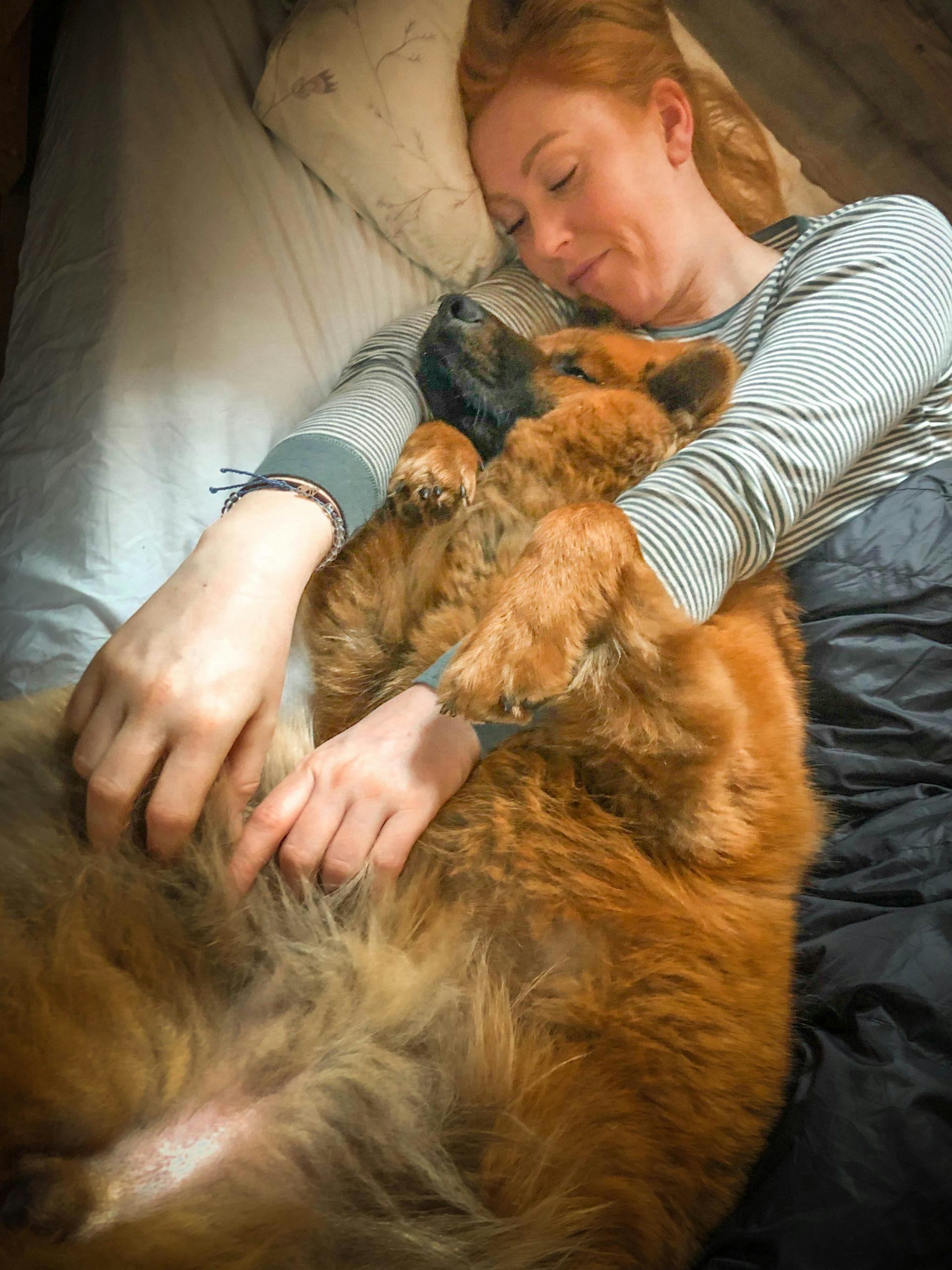Vi sover til vi våkner. Og da får hunden Ronja lov til å komme opp i senga (noe hun gleder seg til hele natta). Ivar fyrer i ovnen og lager kaffe, men ingen av oss står opp før hytta er god og varm.